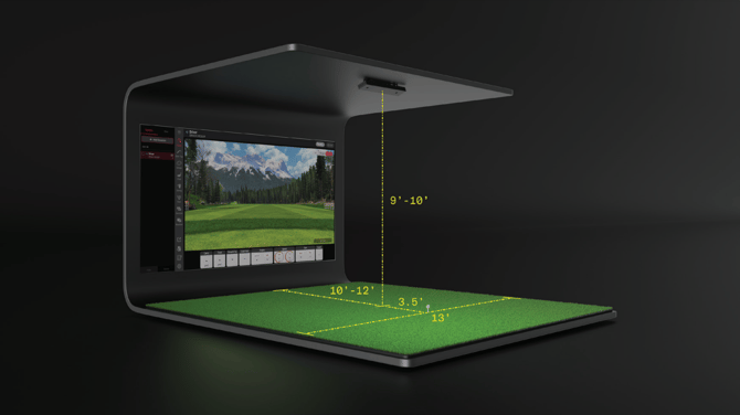 When looking at the impact screen, the distance from the room's left wall to right wall should be at least 13 ft to allow for full driver swings (at least 15 ft for golfers 6 ft or taller). The distance from the impact screen to the tee area is recommended to be at least 12 ft for safety purposes, but if this cannot be met, a minimum of 10 ft may suffice—just be wary of ball bounce-back.